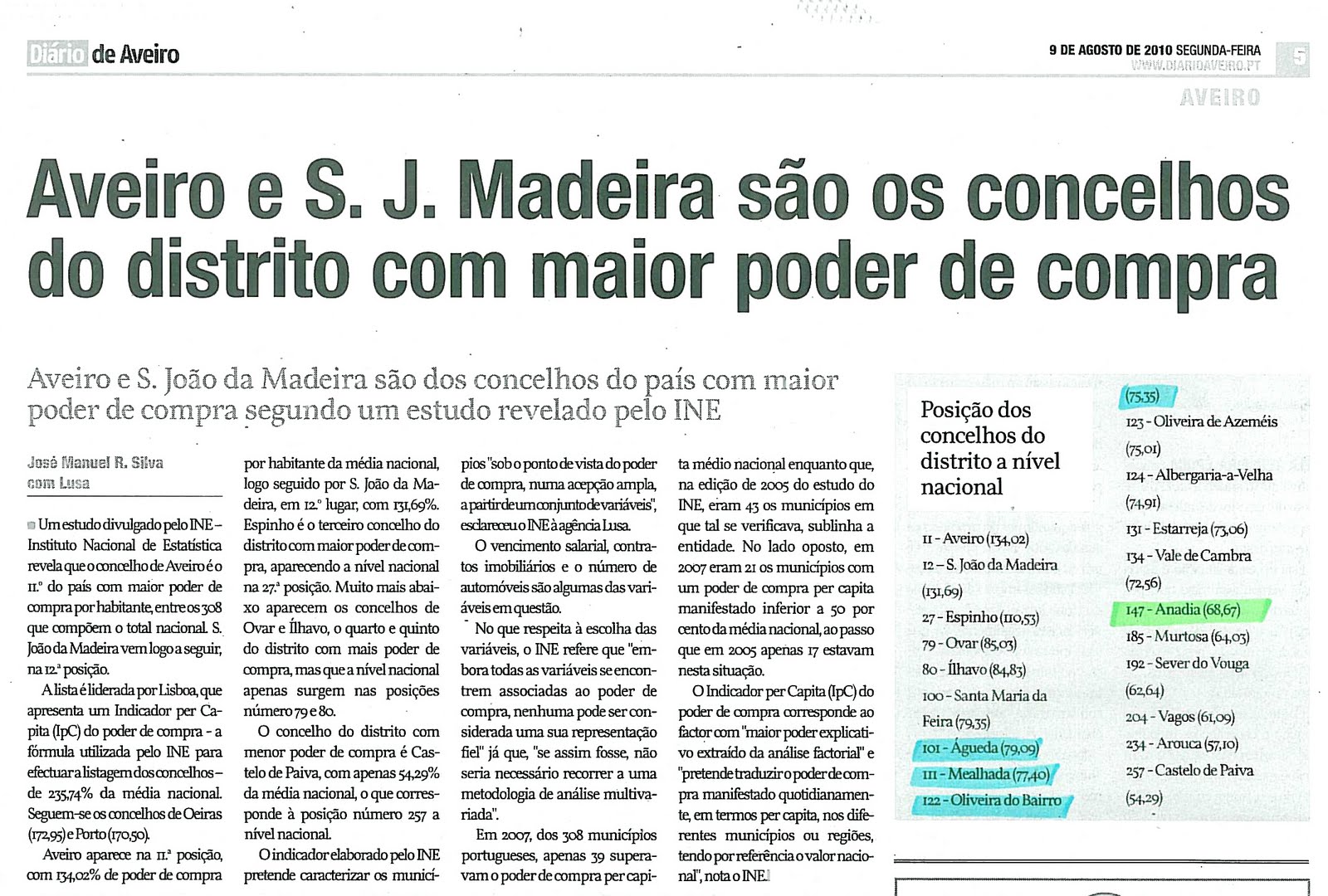 A liderança do poder de compra, como seria de esperar verifica-se nos Concelhos de Lisboa (235,74%), Oeiras (172,95%) e Porto (170,50). O Concelho de Aveiro, 11º da lista nacional apresenta um valor de (134,02%). Na região da Bairrada, Águeda, 101º da lista nacional, apresenta um indicador de 79,09%, Mealhada apresenta um valor de 77,40%, Oliveira do Bairro, classificado na 122ª posição a nível nacional apresenta um valor de 75,35%), ficando Anadia na 147ª posição a nível nacional e com um poder de compra de (68,67%), bem abaixo dos três concelhos vizinhos.